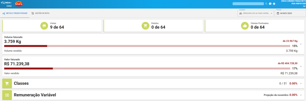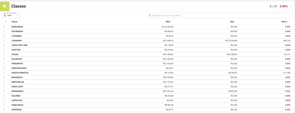 A seção Classes mostra quantos grupos de produtos (empanados, congelados, embutidos etc.) o vendedor conseguiu vender no mês, uma visão clara da diversificação das vendas.