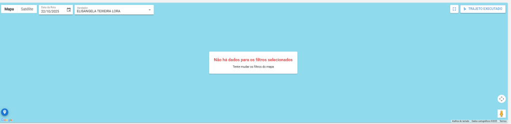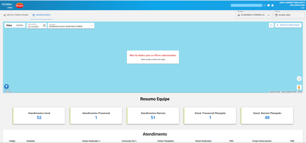 Já o mapa central exibe o rota planejada sendo necessário selecionar um vendedor do seu time para acompanhar o trajeto, pontos de visita e clientes atendidos.
